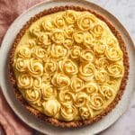 A beautifully crafted Apple & Custard Rose Tart featuring a crisp buttery pastry base filled with silky vanilla custard, topped with delicate apple slices arranged in elegant rose shapes. This impressive tart combines smooth custard and fresh fruit, perfect for a show-stopping dessert.