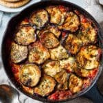 Keywords: aubergine recipe, halloumi recipe, harissa dish, vegetarian skillet bake, Mediterranean bake, easy vegetarian dinner