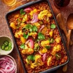 A hearty and aromatic baked coconut dhal featuring tender red lentils and split peas simmered in creamy coconut milk with warming spices, topped with spiced roasted cauliflower and cubed paneer. Served with tangy pickled onions and fresh coriander, this dish offers a comforting, vegan-friendly meal with rich textures and vibrant flavors.
