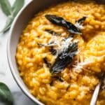 - Serve: Spoon the risotto into bowls, garnish generously with crispy sage leaves, drizzle with 1-2 teaspoons of the browned butter, and sprinkle additional parmesan cheese. Serve immediately and enjoy!
