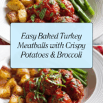 Keywords: turkey meatballs, baked meatballs, crispy potatoes, broccoli side dish, healthy dinner, rosemary garlic, easy weeknight meal