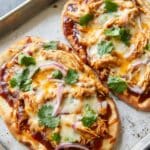 This BBQ Chicken Flatbread recipe is a quick and flavorful meal featuring naan flatbreads topped with tangy BBQ sauce, a blend of mozzarella and cheddar cheeses, shredded rotisserie chicken, red onion, and fresh cilantro. Baked to crispy perfection, this dish makes for an easy and satisfying lunch, dinner, or snack.
