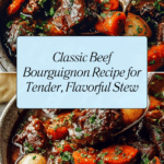 Keywords: Beef Bourguignon, French stew, red wine beef stew, classic French recipe, slow cooked beef, Burgundy stew, cremini mushrooms, pearl onions