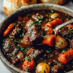 Beef Bourguignon is a classic French stew featuring tender beef simmered in red wine with bacon, vegetables, and mushrooms. This rich and hearty dish, traditionally made with Burgundy wine, combines slow-cooked flavors and a velvety sauce perfect for a comforting meal.