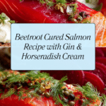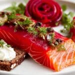 This Beetroot Cured Salmon recipe uses fresh salmon cured with a vibrant beetroot and gin or vodka mixture to create a stunning gravlax. The salmon is cured over 48 hours for deep flavor infusion, then served with creamy horseradish sauce, tangy cucumber ribbons, fried crispy capers, and crunchy rye bread for a perfect balance of flavors and textures. It’s an elegant Scandinavian-inspired appetizer that’s bright, fresh, and ideal for special occasions.