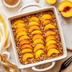 - Assemble and Top: Pour the oatmeal mixture into the prepared baking pan. Arrange sliced peaches on top evenly, then sprinkle with turbinado sugar for added texture and sweetness.