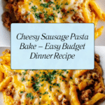 A hearty and budget-friendly sausage cheese pasta bake featuring penne pasta, savory pork sausages, a rich tomato sauce, and a gooey mozzarella and cheddar cheese topping. Perfect for a comforting family meal that’s easy to prepare and packed with flavor.