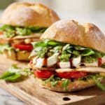 These Caprese chicken sandwiches combine the fresh flavors of ripe tomatoes, basil, and mozzarella with tender cooked chicken breast and a hint of garlic pesto, served on lightly toasted ciabatta rolls. A perfect quick and healthy lunch option that captures the essence of classic Italian Caprese salad in a convenient sandwich form.