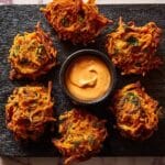 Crispy and flavorful carrot pakoras featuring coarsely grated carrots and shallots, seasoned with turmeric, cumin seeds, and a hint of chili. These golden deep-fried fritters are served with a tangy mint and lime pickle yogurt dip, making them a perfect snack or appetizer.