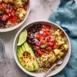 Keywords: Cauliflower burrito bowl, chipotle cauliflower, roasted cauliflower, vegetarian burrito bowl, healthy burrito bowl, brown basmati rice, black beans, avocado, tomato salsa