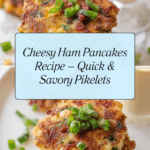 Delicious cheese and ham pancakes, also known as pikelets, fluffy and savory, packed with cheddar, chopped ham, and fresh scallions. Perfect for a hearty breakfast or a satisfying snack, served warm with creamy sour cream and extra toppings.