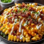 Cheesy loaded fries are the perfect comfort food, combining crispy baked potatoes with gooey cheese, savory bacon, and tangy toppings. This recipe guides you through making them from scratch for a crowd-pleasing snack or side dish.