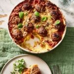 Keywords: cherry tomato ragu, meatball bake, potato crust pie, Italian comfort food, baked meatballs, cheesy meatball dish