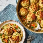A hearty and comforting chicken and ham casserole topped with mustard-infused dumplings. Tender chicken thighs and shredded ham simmered with vegetables in a flavorful cider and thyme broth, finished with fluffy, golden mustard dumplings baked in the oven for a satisfying meal perfect for cozy evenings.
