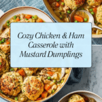 This comforting chicken and ham casserole is a hearty meal perfect for cooler days. Topped with flavorful mustardy dumplings, it brings together tender chicken, smoky ham, and fresh vegetables in a savory stew. Simple to prepare and full of cozy flavors, it’s sure to become a family favorite.