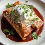 - Warm Sauce and Serve: While the chimichangas cook, warm the red enchilada sauce in a small pan. To serve, spoon the sauce onto plates, place a chimichanga on top, then add a dollop of soured cream, sprinkle extra cheese, and garnish with chopped coriander.