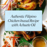 Chicken Inasal is a popular Filipino grilled chicken dish known for its vibrant marinade made with achuete oil, garlic, ginger, lemongrass, vinegar, and citrus juices. This recipe involves marinating spatchcocked poussins in a flavorful blend, pan-searing over a griddle to crisp the skin, and finishing in the oven while basting with a garlic-lemon butter mixture. Served traditionally on toasted banana leaves with pickled atchara and dipping sauces, it’s a delicious and aromatic meal full of tangy, smoky, and savory flavors.