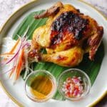 Keywords: Chicken Inasal, Filipino grilled chicken, achuete oil chicken, spatchcock poussin, grilled poussin, Filipino cuisine, grilled chicken recipe, banana leaf serving, atchara, sinamak