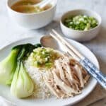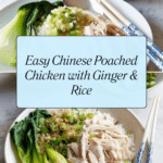 This Chinese poached chicken and rice dish is a comforting and flavorful meal that’s simple to prepare. Tender chicken legs are gently poached with aromatic ginger, garlic, and peppercorns, then served with vibrant pak choi, a savory spring onion relish, and steaming rice. It’s a perfect balance of delicate broth and rich textures.