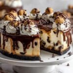 This decadent Chocolate Chip Cookie Dough Cheesecake combines a buttery graham cracker crust with rich, creamy cheesecake filling studded with mini chocolate chips and topped swirled with edible cookie dough balls. Finished with a luscious dark chocolate ganache and fluffy whipped cream, this dessert offers the perfect balance of classic flavors and indulgent textures, ideal for special occasions or any time you crave a luxurious treat.