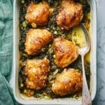 This Coconut & Turmeric Baked Chicken Thighs recipe combines tender, juicy chicken with the vibrant flavors of turmeric, cumin, garlic, and ginger, all enriched by creamy coconut milk. The dish features a bed of wilted spring greens and onions, baked to perfection and finished under a grill for crispy skin. Served with fluffy cooked rice, it’s a comforting yet exotic meal perfect for any night of the week.