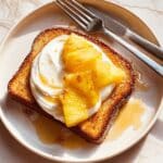 - Serve: Divide the French toast between two plates, top each with a dollop of plain or coconut yogurt, arrange three pieces of roasted pineapple on top, and drizzle with any remaining juices from the roasting dish.