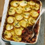 A hearty and comforting Cottage Chilli Hotpot featuring tender braised beef in a spiced tomato and red wine sauce, layered with creamy buttered potatoes and baked to golden perfection. This warming dish combines the rich flavors of cumin, coriander, and chilli with sweet roasted vegetables and kidney beans, perfect for chilly evenings.
