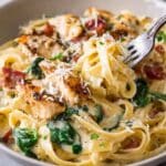 Keywords: Chicken pasta, Fettuccine Alfredo, Creamy chicken pasta, Sun dried tomato pasta, Easy chicken dinner