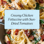 A creamy and flavorful Chicken Fettuccine Alfredo featuring tender shredded chicken, sun-dried tomatoes, baby spinach, and crispy bacon tossed in a rich parmesan cream sauce. Perfectly cooked pasta is coated in a luscious sauce made from garlic, white wine, chicken broth, cream, and parmesan cheese for a comforting yet elegant meal.