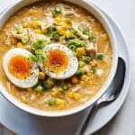 This creamy curried chicken and rice soup combines rich Thai red curry flavors with coconut milk and tender risotto rice for a comforting and hearty meal. Packed with shredded roast chicken, sweetcorn, and topped with perfectly cooked soft-boiled eggs and fresh lime juice, this soup offers a delightful balance of savory, creamy, and zesty notes that make it a perfect dish for any season.