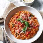 Keywords: Creamy tomato risotto, Italian risotto recipe, vegetarian risotto, easy risotto, tomato risotto with basil and parmesan