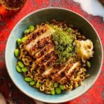 This Crispy Chicken Katsu Noodle Bowl features tender breaded chicken cutlets, perfectly fried until golden and crispy, served over savory rice noodles tossed in a flavorful soy and Japanese barbecue sauce. Topped with edamame, pickled ginger, green onions, nori sheets, and drizzled with a spicy mayo, this dish delivers a delightful combination of textures and bold, vibrant flavors inspired by Japanese cuisine.