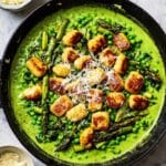 - Cook the vegetables and combine: Add a little more butter to the pan along with asparagus tips. Fry for 2–3 minutes until just cooked. Add peas and pesto along with a splash of water to loosen the sauce. Warm through for a minute, then toss in the fried gnocchi.