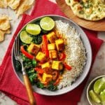 This crispy paneer, spinach, and coconut curry is a flavorful and comforting dish featuring golden-fried paneer cubes simmered in a rich coconut milk and curry paste sauce, enhanced with fresh vegetables like red pepper, broccoli, and spinach. Perfect served with naan, rice, or poppadoms, this curry offers a vibrant blend of spices and textures.
