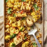 Keywords: curried cod, butter baked fish, roasted cauliflower, chickpeas, Indian spices, healthy fish recipe, oven-baked fish, one-pan dinner
