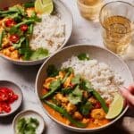 This easy leftover chicken curry is a quick and flavorful way to transform cooked chicken into a delicious meal. Creamy coconut milk and fragrant red curry paste create a comforting sauce paired with fresh sugar snap peas and a hint of lime.