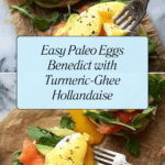 This easy Paleo Eggs Benedict features perfectly poached eggs on toasted English muffins topped with creamy turmeric-ghee hollandaise, fresh arugula salad, avocado, and smoked salmon. A nutritious twist on the classic, combining vibrant flavors and healthy fats for a satisfying brunch or breakfast option.