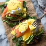 This easy Paleo Eggs Benedict features perfectly poached eggs on toasted English muffins topped with creamy turmeric-ghee hollandaise, fresh arugula salad, avocado, and smoked salmon. A nutritious twist on the classic, combining vibrant flavors and healthy fats for a satisfying brunch or breakfast option.