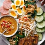 - Assemble the dish: You can create one platter for sharing or individual servings. Arrange the blanched vegetables, crispy tempeh, and boiled eggs (warm or at room temperature) on serving plates. Place the peanut sauce in a separate bowl (serve warm). Sprinkle finely chopped peanuts and optional sliced fresh red chili on top. Serve with prawn crackers on the side for added crunch.