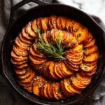 A deliciously simple Sweet Potato Bake that features thinly sliced sweet potatoes tossed in butter, olive oil, garlic, and rosemary, then baked to a tender and slightly crispy perfection. This comforting side dish combines aromatic herbs with roasted sweet potatoes, making it a flavorful addition to any meal.
