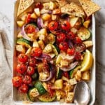 - Combine and Serve: Scatter the crispy pitta chips over the top or around the side of the traybake. Squeeze fresh lemon wedges over the traybake before serving. Serve half immediately while leaving the rest to cool for later use.