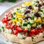This Greek Layer Dip is a vibrant and flavorful appetizer perfect for parties and gatherings. Featuring layers of creamy hummus, cool tzatziki, fresh vegetables, tangy feta, and a drizzle of seasoned olive oil, it brings together classic Mediterranean flavors in a visually appealing and easy-to-prepare dish.