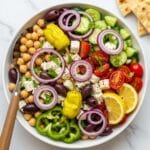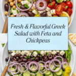 Keywords: Greek salad, Mediterranean salad, chickpea salad, feta cheese, healthy salad, vegetarian, no-cook salad, avocado oil dressing