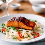Store any leftovers separately in airtight containers in the refrigerator for up to 2 days. Reheat the noodles in a pan or microwave until hot, and warm the salmon gently to avoid drying it out. It’s best served fresh for optimal texture and flavor.