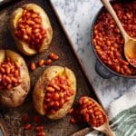 A wholesome and comforting recipe for healthy baked beans served over fluffy jacket potatoes. This dish combines savory haricot beans simmered in a flavorful tomato and date sauce with aromatic spices, making it a nutritious and satisfying meal perfect for any time of the day.