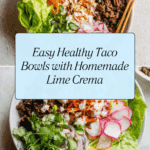 Keywords: healthy taco bowl, ground beef taco bowl, Mexican taco bowl, yogurt lime crema, low carb taco bowl, easy taco recipe