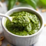 Store pesto in a super airtight container in the refrigerator for up to 3 days. For longer storage, freeze in airtight containers or ice cube trays for up to 3 months. If not stored in a completely sealed container, smooth the surface of the pesto and cover with a thin layer of olive oil to prevent browning when exposed to air. Reheat gently or use at room temperature for best flavor.