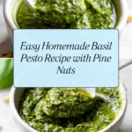 This classic basil pesto recipe features toasted pine nuts, fresh basil leaves, parmesan cheese, garlic, and extra virgin olive oil. It’s a versatile, flavorful sauce perfect for tossing with pasta, spreading on sandwiches, or adding a fresh herbal kick to your favorite dishes. The pesto can be prepared quickly using a food processor or handheld blender, and stores well refrigerated or frozen.