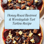 This honey roast beetroot and Wensleydale tart tartine is a beautiful balance of sweet, savory, and creamy flavors. With tender roasted beetroot and onion beneath a golden puff pastry, topped with tangy vegetarian Wensleydale cheese and toasted pecans, it makes an impressive yet simple dish for any meal.