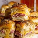 Hot ham and cheese sliders are the perfect party appetizer or cozy meal. Soft rolls filled with savory ham and melted cheese, topped with a flavorful onion poppyseed butter, make these sliders irresistible and easy to share.